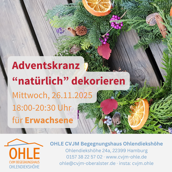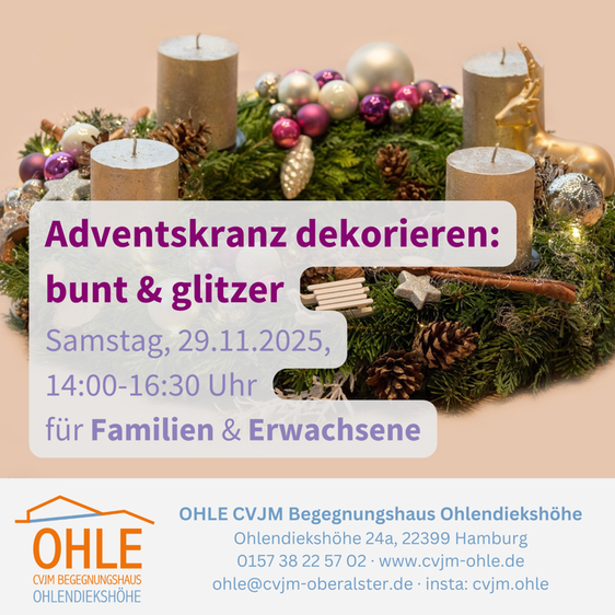 Lasst uns gemeinsam kreativ werden und in gemütlicher Atmosphäre einen Adventskranz dekorieren. Bei Punsch, Keksen und Musik gestalten wir einen Hingucker für dein Zuhause.