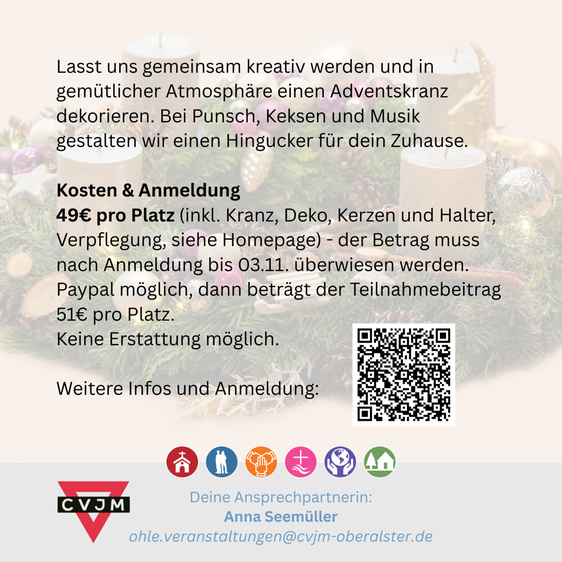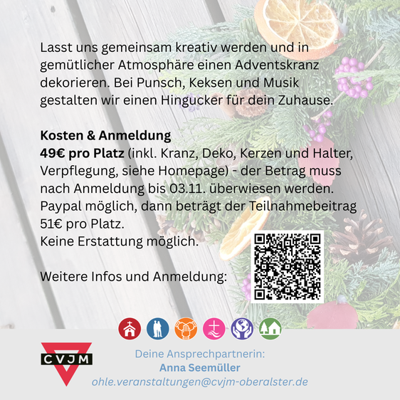 - 49€ pro Platz (inkl. Kranz, Kerzen, Halter, Deko, Verbrauchsmaterial, Verpflegung, siehe oben) - der Betrag muss nach Anmeldung in Vorkasse bis 03.11. überwiesen werden. Paypal möglich, dann beträgt der Teilnahmebeitrag 51€. Keine Erstattung möglich.